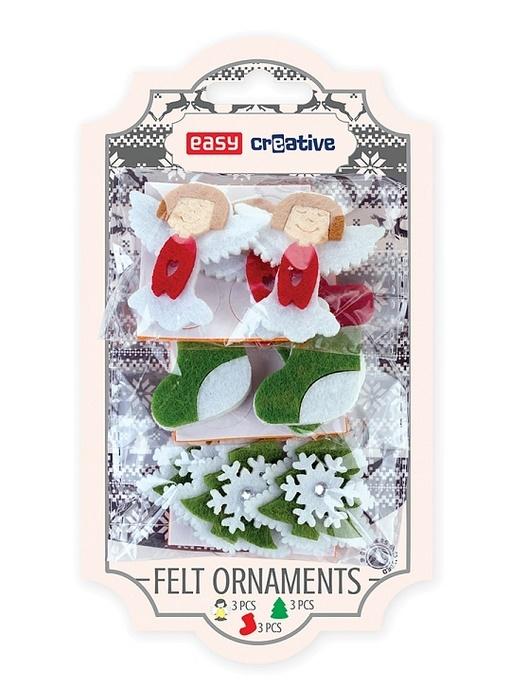 Trójwymiarowe ozdoby filcowe – motyw świąteczny Zestaw zawiera 3 gwiazdki, 3 aniołki oraz 3 skarpety. Wszystkie elementy wykonane zostały z miękkiego, przyjemnego w dotyku filcu. Dzięki załączonej taśmie dwustronnej, ozdoby można przykleić np. do papieru.