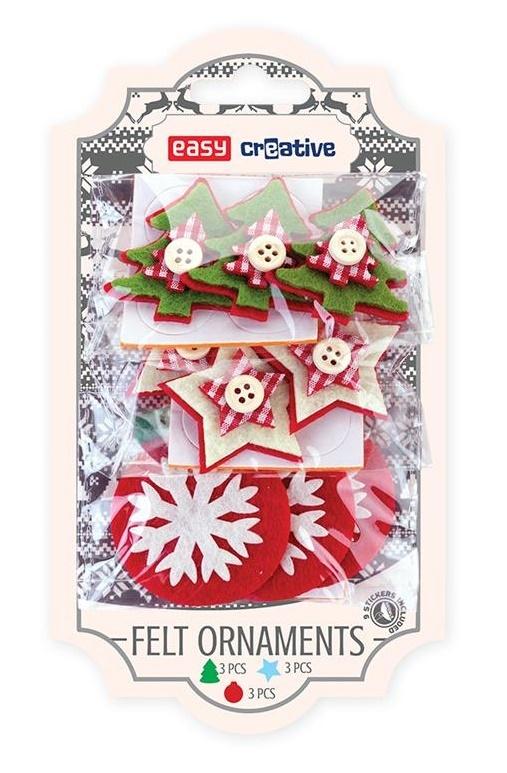 Trójwymiarowe ozdoby filcowe – motyw świąteczny Zestaw zawiera 9 elementów: 3 gwiazdki, 3 choinki oraz 3 płatki śniegu. Wszystkie elementy wykonane zostały z miękkiego, przyjemnego w dotyku filcu. Dzięki załączonej taśmie dwustronnej, ozdoby można przykleić np. do papieru.