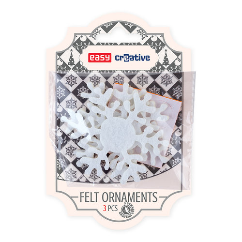Trójwymiarowe ozdoby filcowe – motyw świąteczny: śnieżynki Zestaw zawiera 3 białe śnieżynki o ciekawym kształcie Wszystkie elementy wykonane zostały z miękkiego, przyjemnego w dotyku filcu. Dzięki załączonej taśmie dwustronnej, śnieżynki można przykleić np. do papieru.
