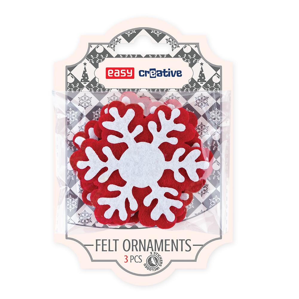 Trójwymiarowe ozdoby filcowe – motyw świąteczny: śnieżynki Zestaw zawiera 3 biało-czerwone śnieżynki o ciekawym kształcie Wszystkie elementy wykonane zostały z miękkiego, przyjemnego w dotyku filcu. Dzięki załączonej taśmie dwustronnej, śnieżynki można przykleić np. do papieru.