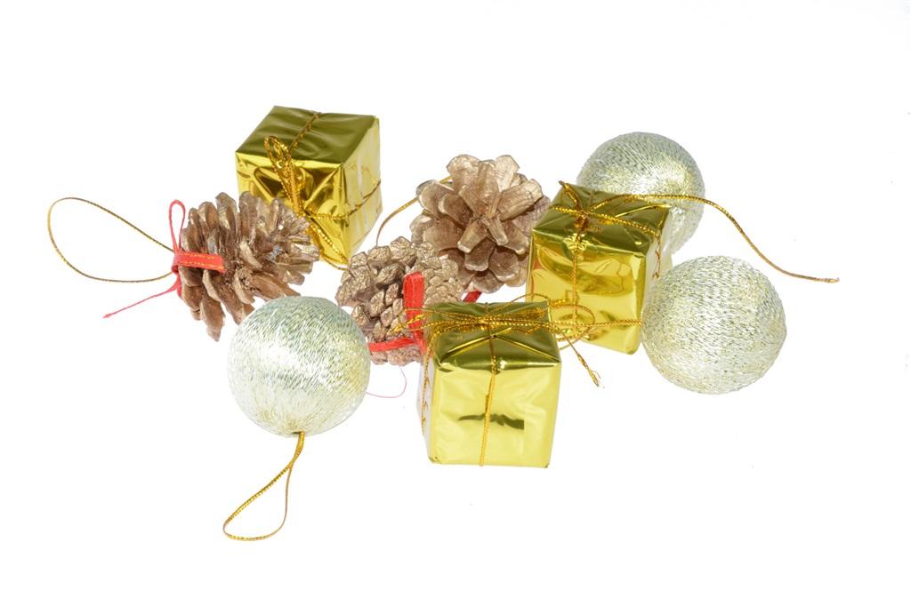Mix świątecznych dekoracji w różnych kształtach. W zestawie zawieszki w kształcie kuli, złote mini prezenciki oraz szyszki naturalne z wstążką. Możliwość użycia do dekoracji choinki lub świątecznych stroików i kompozycji. Dekoracje w rozmiarach około 3,5 cm.