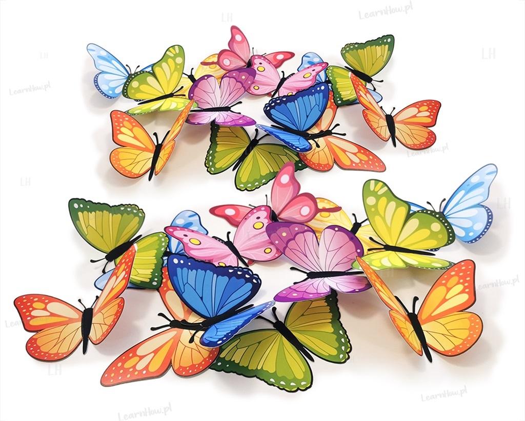 Zestaw składa się z 12 unikalny motylków - łącznie w zestawie motylków jest 30 - idealne do wiosennej dekoracji szkoły i przedszkola.