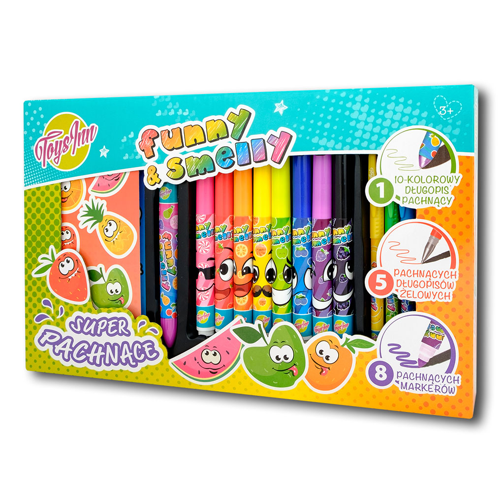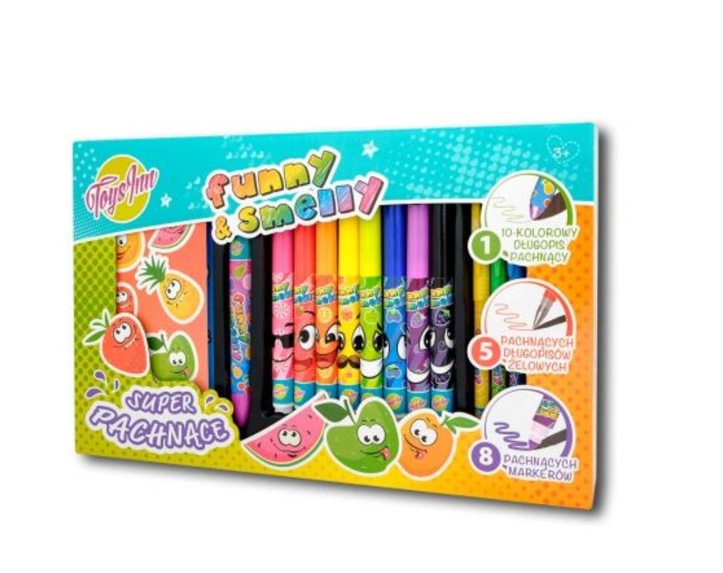 Zestaw pachnący mały zawiera: jeden 10-kolorowy długopis pachnący, 2 arkusze pachnących naklejek, 5 pachnących długoppisów żelowych oraz 8 pachnących markerów.