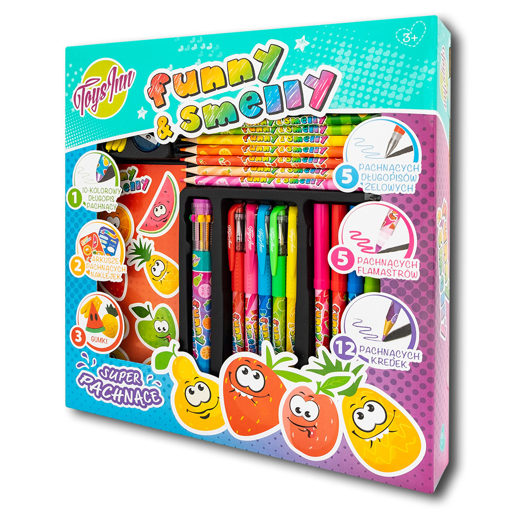 Pachnący zestaw szkolny zawiera: jeden 10-kolorowy długopis pachnący, 12 pachnących kredek, 5 pachnących długopisów żelowych, 5 pachnących markerów, temperówkę, 2 arkusze pachnących naklejek, 3 gumki.
