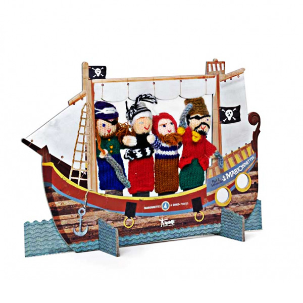 W mini zestawie marki Londji® znajduje się tekturowy teatrzyk o kształcie statku pirackiego oraz 4 sztuki wełnianych kukiełek na palce. Materiał nie powoduje alergii, nie rozciąga się, pacynki nie spadają z palców.