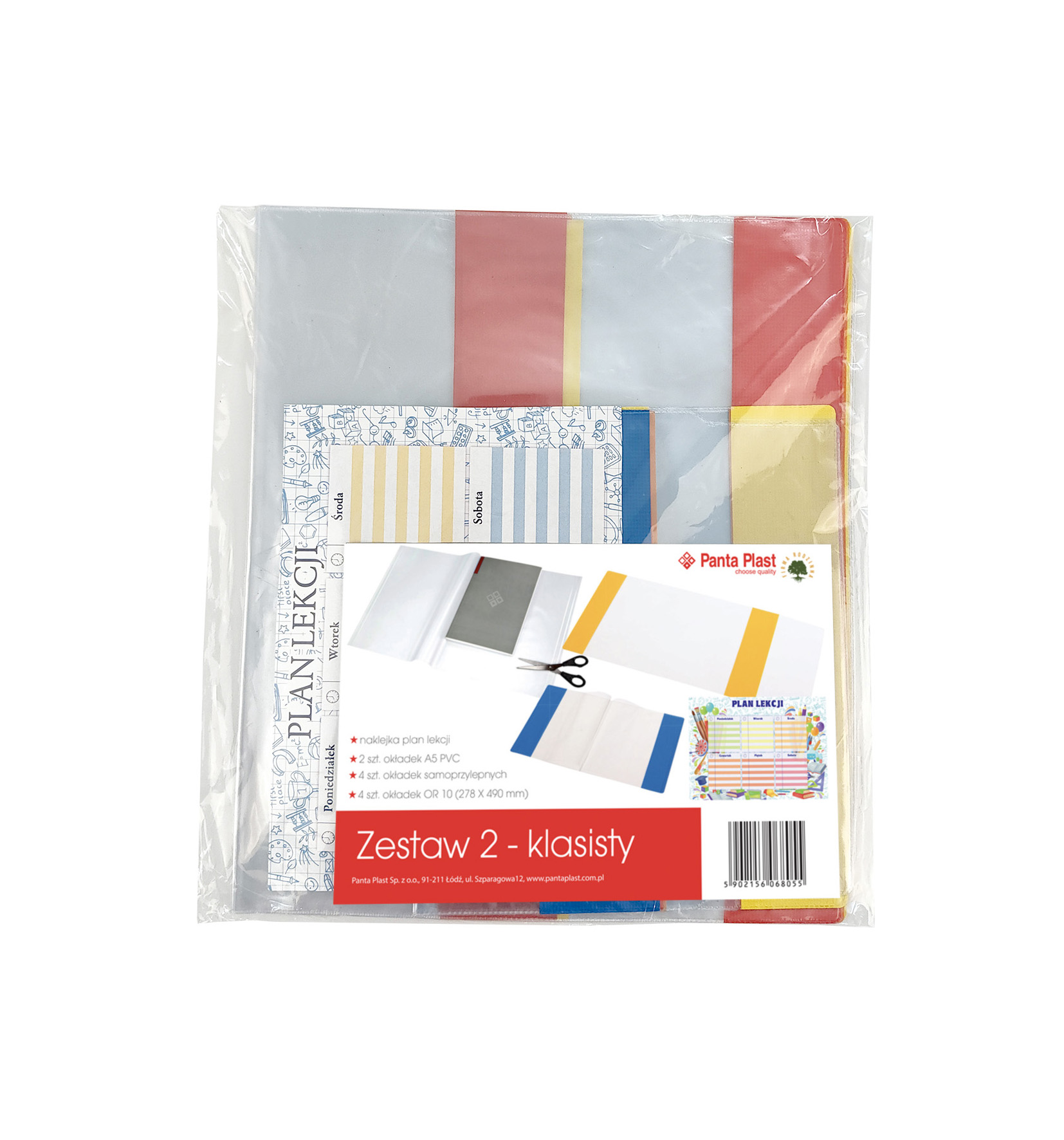 Zestaw zawiera: 4 szt okładki or 10 (278 X 490mm); 4 szt okładki samoprzylepnej; 2 szt okładki A5 pvc oraz naklejka plan lekcji.