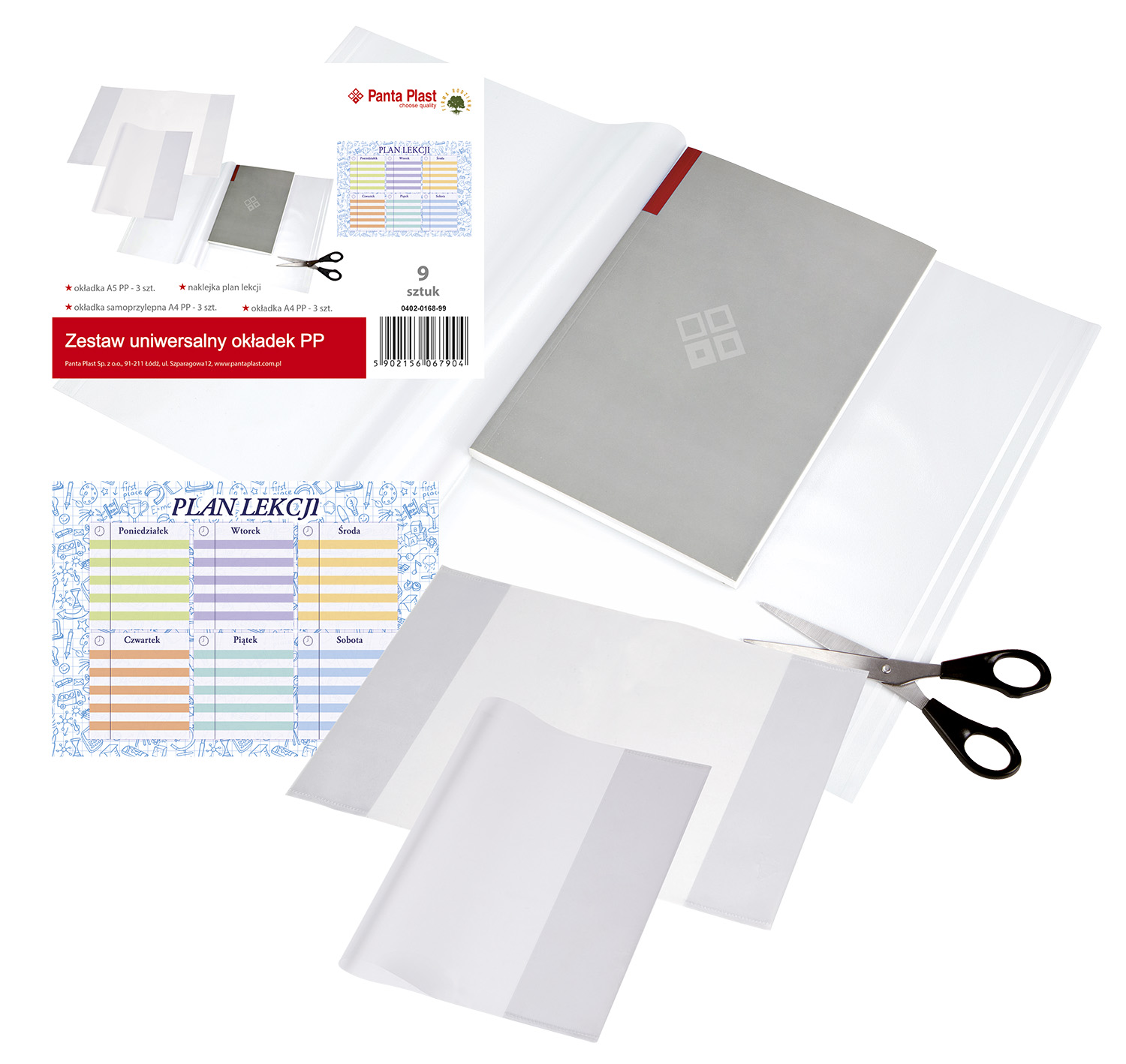 3 szt okładki A4 PP; 3 szt okładki A5 PP; 3 szt okładki A4 samoprzylepnej oraz naklejka plan lekcji.