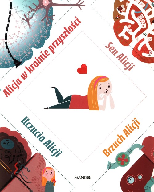 Alicja w krainie przyszłości, czyli jak działa sztuczna inteligencja  Kiedy w domu Alicji pojawia się nowy członek rodziny – Basia, robot humanoidalny – rodzą się też nowe pytania. Czy życie domowników stanie się teraz łatwiejsze? Czy Basia będzie odrabiać lekcje za Alicję, zmieniać pieluchy Adasia i gotować obiady? I najważniejsze – czy robot może zastąpić człowieka? Sen Alicji, czyli jak działa mózg Gdy Alicja śpi, budzą się neurony. Prawdę mówiąc, one nigdy nie śpią, co najwyżej potrzebują nieco odpocząć. Tym razem mózg Alicji postanowił wyprodukować nietypowy sen, podczas którego opowie, w jaki sposób dowodzi całym organizmem. Sen Alicji podarował czytelnikom profesor Jerzy Vetulani. Był nie tylko wybitnym naukowcem, ale również gawędziarzem prosto i zabawnie wyjaśniającym sekrety nauki. Rewelacyjnie zilustrowana opowieść Profesora to porcja bezcennej wiedzy i mnóstwo śmiechu. Uczucia Alicji, czyli jak lepiej poznać siebie Instrukcja obsługi emocji − tak w skrócie można nazwać nową opowieść o losach Alicji. Tym razem mała bohaterka prowadzi czytelnika przez rozmaite stany uczuciowe, których codziennie doświadczamy. Doktor Ewa Woydyłło-Osiatyńska we wciągający – zarówno dla dzieci, jak i dla dorosłych sposób – opowiada o tym, jak nauczyć dziecko samodzielnie rozpoznawać emocje, zrozumieć siebie, swoich przyjaciół i otaczający nas świat. Bo dziecku, które zna swoje uczucia, łatwiej stać się szczęśliwym dorosłym. Brzuch Alicji W kupie siła! Przed Alicją stoi nietypowe zadanie – musi rozwiązać zagadkę i dowiedzieć się, jak działa ludzkie ciało. Okazuje się, że to nie takie proste, bo w trakcie śledztwa pojawia się coraz więcej pytań! Dlaczego w brzuchu burczy? Jak długie są jelita i ile flaczków mieści się w naszym brzuchu? Skąd kupa wie, kiedy ma wyjść, i czemu brzydko pachnie? Dlaczego mówimy, że „leci nam ślinka”, oraz doświadczamy nieprzyjemnych rzeczy, takich jak wymioty czy biegunka? Popularny prof. Mikołaj Spodaryk – ulubieniec dzieci, wybitny pediatra, który dla najmłodszych postanowił sobie wytatuować na ręce świnkę Peppę, a po szpitalnych korytarzach chodzi w przebraniu Pokemona – razem z bohaterką Alicją bierze pod lupę układ trawienny człowieka.