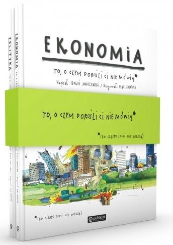 Zestaw dwóch książek: "Ekonomia. To, o czym dorośli Ci nie mówią" Zdecydowanie wyjątkowa książka dla każdego (od 10 do 113 lat). Skąd się biorą pieniądze, jak zarobić, ale się za bardzo nie narobić, co się opłaca, a co nie, gdzie kupić taniej, jak ratować sytuację, kiedy w skarbonce albo w portfelu widać dno. Po co Ci ekonomia?! Przekonaj się. "Ta książka dowodzi, że o ekonomii można mówić nie tylko jasno, ale i z humorem. Dostajemy tu solidną dawkę wiedzy o podstawowych i nieco bardziej zaawansowanych zjawiskach gospodarczych. Czyta się szybko, a zapamiętuje jeszcze szybciej - dzięki zabawnym, czasem przewrotnym rysunkom. To książka dla każdego młodego bystrzaka. Ale nie tylko! Mamo i tato: pożyczcie "Ekonomię" od waszego dziecka. Sporo się dowiecie, i będziecie się przy tym dobrze bawić!" Aleksandra Dziadykiewicz, dziennikarka Radia TOK FM, wyróżniona w Konkursie NBP im. Władysława Grabskiego dla dziennikarzy ekonomicznych w 2015 roku "Polityka. To, o czym dorośli Ci nie mówią" Autorzy udowadniają, że dla młodego czytelnika nie ma zbyt skomplikowanych tematów. Prosty język, humor i wyjątkowe ilustracje sprawiają, że z pozoru trudne polityczne sprawy stają się zrozumiałe dla wszystkich (od 9 do 113 lat). Po co jest władza i jak ją zdobyć? Czy demokracja to najlepszy sposób na rządzenie? Do czego potrzebne jest państwo? Skąd państwo bierze pieniądze? Dlaczego politycy przepadają za kiełbasą wyborczą i czy można się nią przejeść? Czego broni Konstytucja?