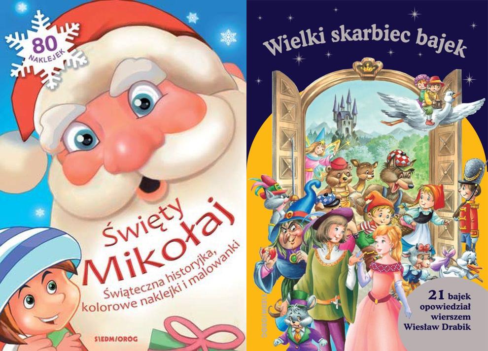 Pakiet mikołajkowy: Wielki skarbiec bajek: "W tym pięknym skarbcu bajek i baśni zebrano 21 utworów należących do światowego kanonu literatury dziecięcej, między innymi Kopciuszka, Królewnę Śnieżkę, Czerwonego Kapturka, Jasia i Małgosię, Śpiącą królewnę czy Tomcia Palucha. Skarbiec adresowany jest do najmłodszych czytelników. Dzieła braci Grimmów, Charles’a Perraulta i Hansa Christiana Andersena zostały opowiedziane wiernie, a zarazem w sposób, który dzieci lubią najbardziej – wierszem. Książka opatrzona jest pięknymi ilustracjami, pozwalającymi śledzić w szczegółach każdą scenę i nadającymi lekturze pełen uroku klimat." Święty Mikołaj. Świąteczna historyjka, kolorowe naklejki i malowanki: Nadchodzą święta Bożego Narodzenia. Dzieci na całymświecie szykują się do świąt, malując, naklejając i pisząc listy do ŚwiętegoMikołaja. Ale na dalekiej północy szczodrobliwy święty ma zatroskanąminę. Cały dzień wypatruje przez okno. „Gdzie jest listonosz? – pyta.– Wciąż nie dostarczył mi listów od dzieci!”...