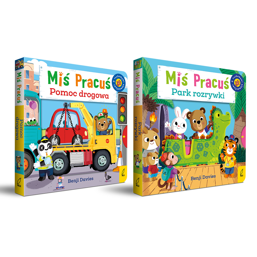 Poznawajcie świat z Misiem Pracusiem! Czytając wesołe książeczki i przesuwając ruchome elementy, mały czytelnik może poznać różne zawody lub miejsca.