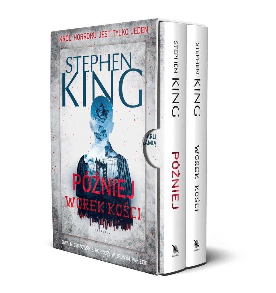 KRÓL HORRORU JEST TYLKO JEDEN STEPHEN KING JEDEN Z NAJWAŻNIEJSZYCH AUTORÓW NA ŚWIECIE HORRORY, KTÓRE MROŻĄ KREW W ŻYŁACH HISTORIE O DUCHACH, KTÓRE TAK NAPRAWDĘ OPOWIADAJĄ O LUDZKIEJ PSYCHICE MISTRZOWSKA NARRACJA OD AUTORA JEDYNEGO W SWOIM RODZAJU ZANURZ SIĘ W OPOWIEŚCIACH, KTÓRE NIE POZWOLĄ CI ZASNĄĆ! Pakiet zawierający dwa horrory autorstwa Stephena Kinga: nowość 2021 PÓŹNIEJ i klasyczny horror WOREK KOŚCI PÓŹNIEJ TYLKO UMARLI NIE MAJĄ SEKRETÓW. Jamie od najmłodszych lat widuje zmarłych. I nie przypomina to tego, co znamy ze słynnego filmu z Bruce'em Willisem. Jamie może zobaczyć to, czego nikt inny nie widzi, i poznać sekrety, których nikt inny nie zna. Ale cena, jaką musi płacić za swoje nadnaturalne zdolności, jest bardzo wysoka. O czym doskonale wie matka Jamiego, która namawiała go, aby nikomu nie mówił, co potrafi. Taki dar nie może długo jednak pozostać niezauważony. I Jamie wkrótce będzie musiał pomagać nowojorskiej policji w śledztwie w sprawie, w której pewien morderca groził uderzeniem zza grobu. Czasami dorastać znaczy stanąć twarzą w twarz z prześladującymi cię demonami. Później, najnowsza powieść Stephena Kinga, to horror w najlepszym wydaniu przerażający i poruszający. To także historia o straconej niewinności i konieczności wyborów między dobrem a złem. Uważny czytelnik znajdzie w niej echa jednej z najsławniejszych powieści Kinga TO i odpowiedź na pytanie, co trzeba zrobić, aby stawić czoło złu we wszystkich jego postaciach. Masz ochotę na dreszcz emocji, ale nie masz czasu na czytanie 1000-stronicowej powieści? To idealna lektura przed snem. Tylko nie myśl, że później zaśniesz Kirkus Reviews WOREK KOŚCI JEDNA Z NAJBARDZIEJ PORUSZAJĄCYCH KSIĄŻEK STEPHENA KINGA, ZAINSPIROWANA SŁYNNĄ REBEKĄ DAPHNE DU MAURIER. DOSKONAŁA POWIEŚĆ OBYCZAJOWA, KTÓRA STRONA PO STRONIE PRZEISTACZA SIĘ W JEDEN Z NAJBARDZIEJ PRZERAŻAJĄCYCH HORRORÓW KRÓLA GROZY. NAJWIĘKSI FANI MISTRZA WRACAJĄ DO TEJ LEKTURY PO WIELEKROĆ I ZA KAŻDYM RAZEM ODKRYWAJĄ CORAZ WIĘKSZĄ PRZYJEMNOŚĆ Z JEJ CZYTANIA Cztery lata po tragicznej śmierci żony autor bestsellerów, Mike Noonan, przeżywa kryzys twórczy. Niezdolny do pisania, wypalony psychicznie i prześladowany wspomnieniami, postanawia wrócić do miejsca, w którym kiedyś spędził z żoną najszczęśliwsze dni życia, do domu nad jeziorem we wschodnim Maine. Wkrótce po przyjeździe zostaje wciągnięty w konflikt między młodą wdową a jej teściem, lokalnym magnatem, który chce zyskać prawo do opieki nad trzyletnią wnuczką. Mike, widząc w dziewczynce córkę, której pozbawił go los, nie waha się, po której stanąć stronie w coraz bardziej zaciekłym sporze. Dramatyzmu sytuacji nadaje atmosfera w domu najwyraźniej nawiedzanym. A zmarła żona Mike'a najwyraźniej chce mu coś przekazać. W 2011 roku na podstawie powieści nakręcono miniserial telewizyjny, w roli głównej wystąpił Pierce Brosnan.