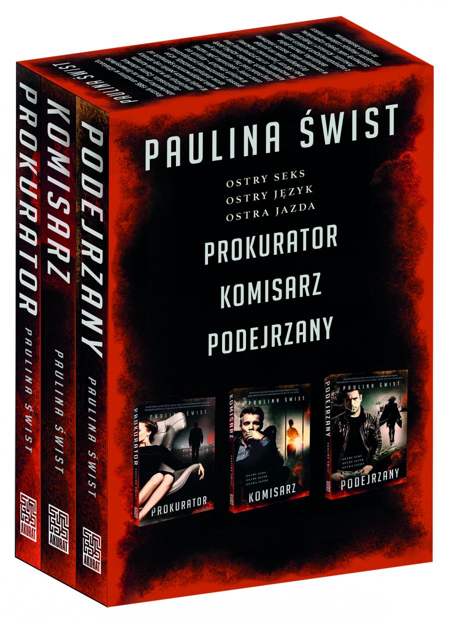 Prokurator: Trzydziestoletnia, niezwykle atrakcyjna Kinga Błońska jest szczęśliwą kobietą. To znaczy była. Od wielu lat dzieliła życie z tym samym mężczyzną a zawodowo, jako błyskotliwa adwokatka, odnosiła sukcesy na sali sądowej. Teraz jednak fortuna przestała jej sprzyjać: nie dość, że przyłapała męża na zdradzie, to musiała również podjąć się prowadzenia sprawy groźnego bandyty Szarego. Co gorsza, Szary jest jej przyrodnim bratem, z którym od dawna nie miała i nie chciała mieć nic do czynienia. Wydarzenia ostatnich tygodni postanawia odreagować w dyskotece. Po raz pierwszy w życiu ma ochotę zachować się nieodpowiedzialnie i udaje się jej to aż za bardzo. Ląduje w mieszkaniu Łukasza, którego dopiero co poznała na parkiecie. Po niesamowitych miłosnych uniesieniach, zaspokojna seksualnie, ale skacowana moralnie, ukradkiem wraca do domu. Zaledwie kilka godzin później przekonuje się, że pech upodobał ją sobie na dobre: "facet na jedną noc" okazuje się prokuratorem prowadzącym sprawę jej przyrodniego brata. Jakby tego było mało, wszystko wskazuje na to, że pozasłużbowe kontakty Kingi i Łukasza nie ograniczą się do jednego gorącego spotkania OSTRY SEKS, OSTRY JĘZYK, OSTRA AKCJA. JESZCZE ŻADNA NOWA GWIAZDA NIE EKSPLODOWAŁA Z TAKĄ SIŁĄ NA FIRMAMENCIE POLSKIEGO KRYMINAŁU. Komisarz: Zuzanna Kadziewicz żyje jak pod kloszem. Kochający ojciec-biznesmen trzyma nad ukochaną jedynaczką parasol finansowy. Zuzanna pracuje jako pedagog z pasji, nie dla chleba. Uwielbia pomagać dzieciom. W jej odrealnionym świecie pewnego dnia pojawia się mężczyzna Radosław jest wykształcony, męski, przystojny, dobrze wychowany, zamożny. Potrafi się znaleźć w teatrze, cierpliwie doradzać w butikach. W dodatku, po pięciu tygodniach znajomości, wyjaśnia się, że jest gentelmanem w łóżku. Prawdziwy ideał. Niestety, wyśniony mężczyzna okazuje się policjantem. Komisarz Radosław Wyrwa fachowiec od działań pod przykrywką. Zuzanna to dla niego tylko figurantka, zaledwie narzędzie służące do rozpracowania ciemnych interesów ojca. Antoni Kadziewicz, na pozór szanowany biznesmen, w rzeczywistości zwabia z Ukrainy dziewczyny do domów publicznych. Zadłużony, szantażowany przez ukraińskich mafiosów, nie potrafi wydostać się z matni. Szansą może być współpraca z prokuratorem Łukaszem Zimnickim. Zimny przedstawia plan. Kadziewicz w obawie przed dożywociem, godzi się zostać wtyką i podejmuje grę na dwa fronty Podejrzany: To nie żarty, to nie przelewki, tu się dzieje, i to jak! W roku 2014 Daniel Wyrwa był jeszcze żołnierzem 6. Batalionu Powietrzno-Desantowego w Gliwicach, a Maria Zimnicka dobrze zapowiadającą się aplikantką adwokacką. Daniel, delikatnie mówiąc, nie miał dobrej reputacji. Wszyscy poza Marią wiedzieli o jego problemach z prawem, z narkotykami, ze skłonnością do przemocy i do maczania palców w nielegalnych przedsięwzięciach, ale przecież miłość nie wybiera Maria urodziła córeczkę, Daniel wylądował na odwyku, Maria wyszła za mąż za kolegę z dzieciństwa, a potem Potem zrobiło się szybko, ostro, groźnie, błyskotliwie, zaskakująco i wciągająco. Fani Pauliny Świst dostaną więcej, niż oczekują, nowi czytelnicy natychmiast sięgną po jej wcześniejsze książki. Gwiazda świeci coraz jaśniej!