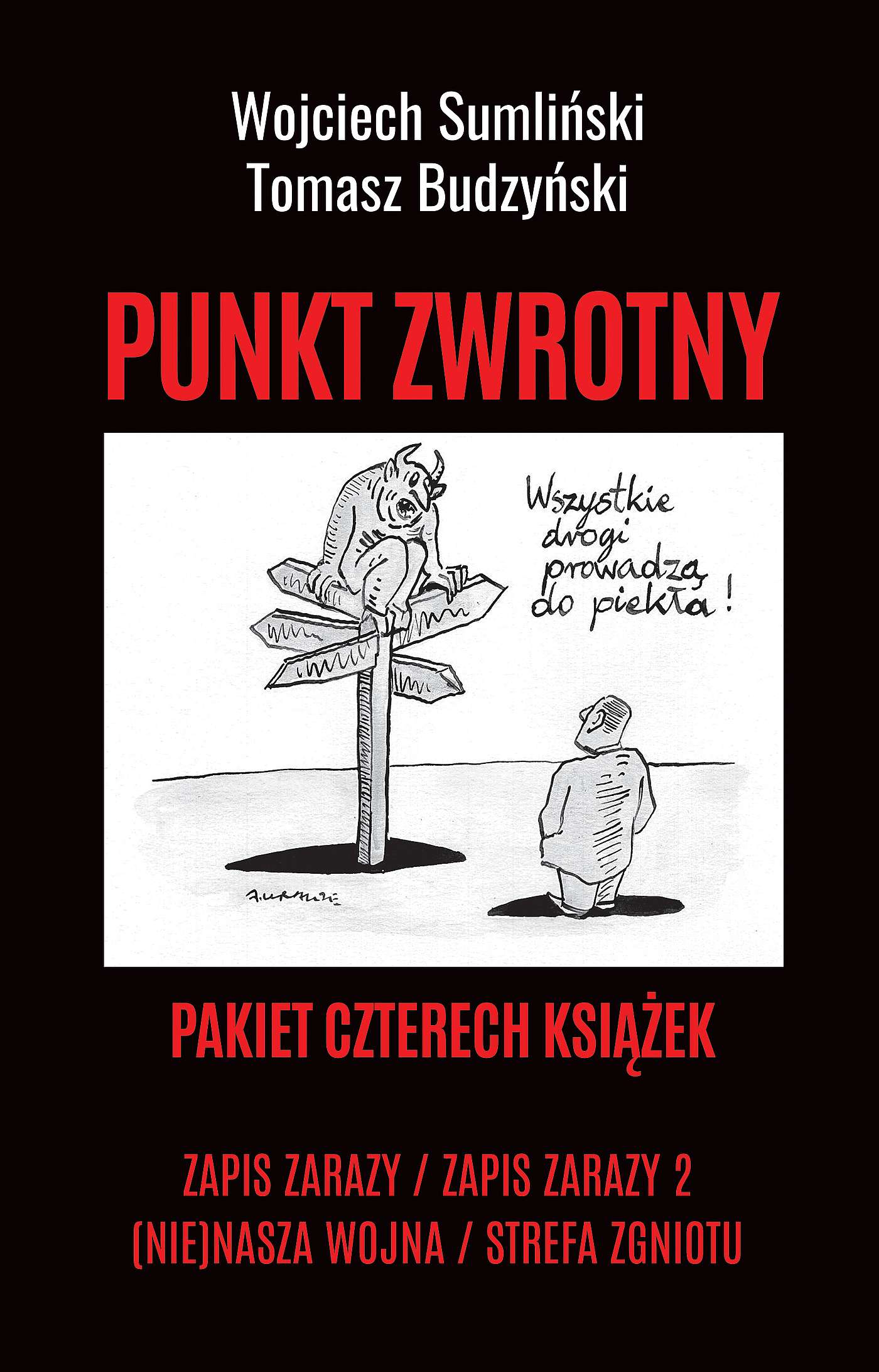 Pakiet czterech książek - Zapis zarazy, "Zapis zarazy 2", "(Nie)nasza wojna", "Strefa zgniotu" -                                                              które połączone w całość zmieniają sposób patrzenia na nasza rzeczywistość. Kiedyś sądzilismy, że to rzeczywistość w miarę bezpieczna, ale dziś nikt już tak nie myśli. Światowa pandemia i światowa mistyfikacja, na które nakłada się światowy kryzys i wojna na Ukrainie - zmieniły wszystko. Znaleźliśmy się w miejscu, w którym nie planowaliśmy sie znaleźć, zadając sobie szereg pytań.                                         Co dalej z pandemią wszech czasów, która zmieniła wyobrażenie o przeszłości i co jeszcze szykują nam globaliści?                                                                        Dokąd prowadzi gospodarczy krach, który niszcząc teraźniejszość, wywołuje lęk i pytania o przyszłość?                                                                                   Czy wojna na Ukrainie, to dogasający konflikt, czy katalizator wojny na Pacyfiku i zarzewie światowego pożaru?                                                                     Czy Rosja dokona nuklearnego ataku i dlaczego amerykańscy analitycy określają Polskę strefą zgniotu?