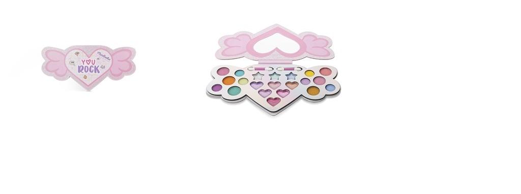 Paleta do dziecięcego makijażu w kształcie serca ze skrzydłami i z lustrem w zestawie. Zestaw zawiera: 12 cieni do powiek, 9 błyszczyków do ust, 2 aplikatory.