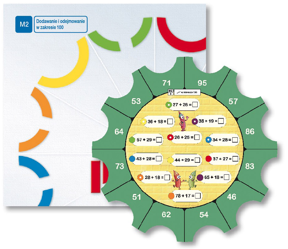 Tarcze ćwiczeń M2 to komplet 12 tarcz ćwiczeń do "Palety" przeznaczonych dla dzieci w nauczaniu początkowym. Obejmują podstawowe działania arytmetyczne tj. dodawanie i odejmowanie w zakresie 100 bez przekraczania i z przekroczeniem progu dziesiątkowego, dodawanie i odejmowanie trzech liczb. Wykonywanie kolejnych zadań doskonali, nie tylko pamięciowe opanowanie umiejętności liczenia, ale przede wszystkim zdolność formułowania wniosków i dochodzenia do wyniku samodzielnie, tak żeby abstrakcyjna dla dzieci wiedza była łatwiej przyswajalna. Wszystkie tarcze zostały opracowane zgodnie z zasadą stopniowania trudności, po to, żeby dziecko zachęcone sukcesem przy rozwiązywaniu pierwszych zadań, chętnie podejmowało próby rozwiązywania kolejnych. Najpierw wyjmujemy klocki. Wybraną tarczę nakładamy stroną z zadaniami do góry na dwa kołeczki w Palecie Bierzemy jeden z kolorowych klocków, rozwiązujemy zadanie oznaczone takim samym kolorem jak klocek i kładziemy go na pole obok poprawnej odpowiedzi. Zdejmujemy tarcze, odwracamy ją na drugą stronę i nakładamy ponownie na kołeczki. Samokontrola: wszystkie zadania są prawidłowo rozwiązane, jeśli kolory klocków zgadzają się z kolorami półkoli na stronie kontrolnej tarczy. Jeżeli wzór kolorystyczny nie jest zgodny ze sobą, to wyjmujemy nie pasujące klocki, tarczę odwracamy na stronę z zadaniami i jeszcze raz rozwiązujemy niepoprawnie wykonane zadania.