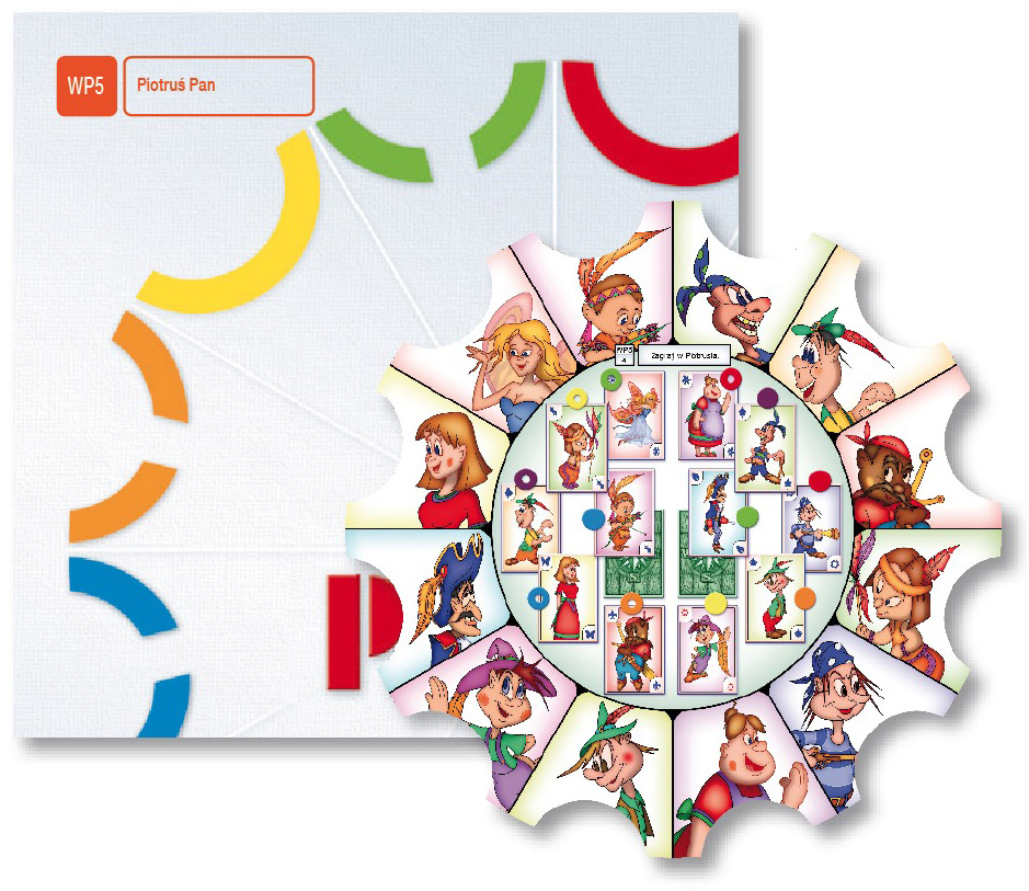 Tarcze ćwiczeń WP5 - Piotruś Pan to komplet 12 tarcz ćwiczeń ze zbiorem zabaw ogólnorozwojowych w formie obrazkowej oraz jedna tarcza blanko: wyszukiwanie podobieństw, różnic i brakujących elementów, porządkowanie elementów w całości, rozpoznawanie kolorów, klasyfikowanie i dobieranie obrazków według określonych cech, takich jak: wielkość, kształt, barwa, przeznaczenie, wyszukiwanie podobieństw i różnic pomiędzy przedmiotami. Tarcze ćwiczeń służą do nauki i zabawy z Zestawem Kontrolnym PALETA. Najpierw wyjmujemy klocki. Wybraną tarczę nakładamy stroną z zadaniami do góry na dwa kołeczki w Palecie Bierzemy jeden z kolorowych klocków, rozwiązujemy zadanie oznaczone takim samym kolorem jak klocek i kładziemy go na pole obok poprawnej odpowiedzi. Zdejmujemy tarcze, odwracamy ją na drugą stronę i nakładamy ponownie na kołeczki. Samokontrola: wszystkie zadania są prawidłowo rozwiązane, jeśli kolory klocków zgadzają się z kolorami półkoli na stronie kontrolnej tarczy. Jeżeli wzór kolorystyczny nie jest zgodny ze sobą, to wyjmujemy nie pasujące klocki, tarczę odwracamy na stronę z zadaniami i jeszcze raz rozwiązujemy niepoprawnie wykonane zadania.