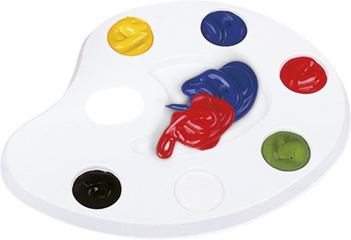 Paletka malarska do mieszania farb wykonana z tworzywa sztucznego. Posiada 6 wgłębień na farby, wygodny uchwyt oraz miejsce do odłożenia pędzelka.