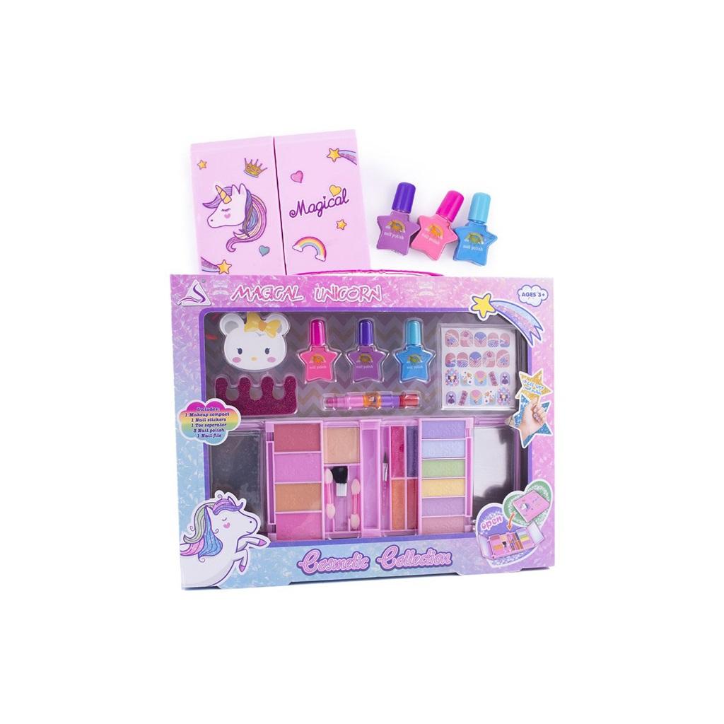 Paletka cieni, błyszczyków i lakierów to marzenie dla każdej małej stylistki. Dzięki temu zestawowi każda mała dziewczynka będzie mogła przenieść się w świat własnych stylizacji. Zabawka, która pozwoli na rozwijanie umiejętności manualnych dziecka ale także kreatywną i ciekawą zabawę. Zestaw zawiera kolorowe cienie i błyszczyki, którymi dziewczynka będzie mogła bawić się w prawdziwy salon piękności. W zestawie znajdziemy także lakiery i naklejki na paznokcie. Całość zamknięta jest w kolorową zamykaną paletkę z lusterkiem.