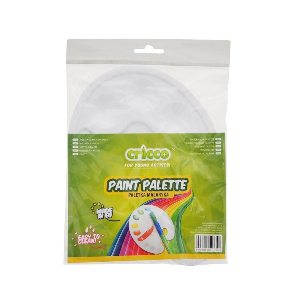 Owalna paleta malarska wykonana z wytrzymałego tworzywa. Posiada 10 wgłębień. Polecana przy malowaniu farbami plakatowymi i tempera. Wymiar 23 x 17 cm.