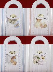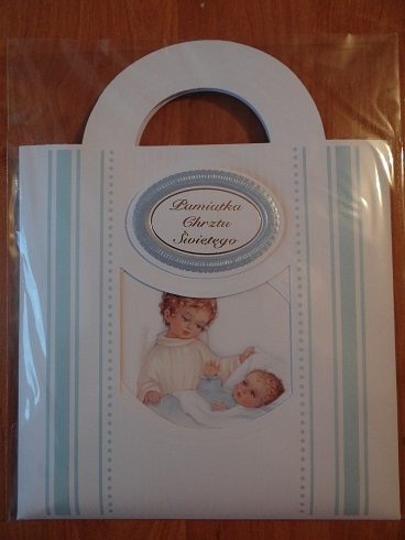 ""Album Torebka"" Oryginalna pamiątka przeznaczona na Chrzest Święty. Jedyny na rynku albumik z torebką w komplecie. Torebka zdobiona tłoczeniem oraz perłową folią tłoczoną na gorąco. Wycięcie ukazuje wzór albumu co w połączeniu z dopasowanym kolorystycznie wzorem torebki tworzy niepowtarzalną całość.  Książeczka zawiera sentencje, myśli oraz modlitwy związane z uroczystością Chrztu Świętego. Jest tu także miejsce na wpisanie informacji o miejscu, dacie Chrztu Świętego oraz Rodzicach Chrzestnych.