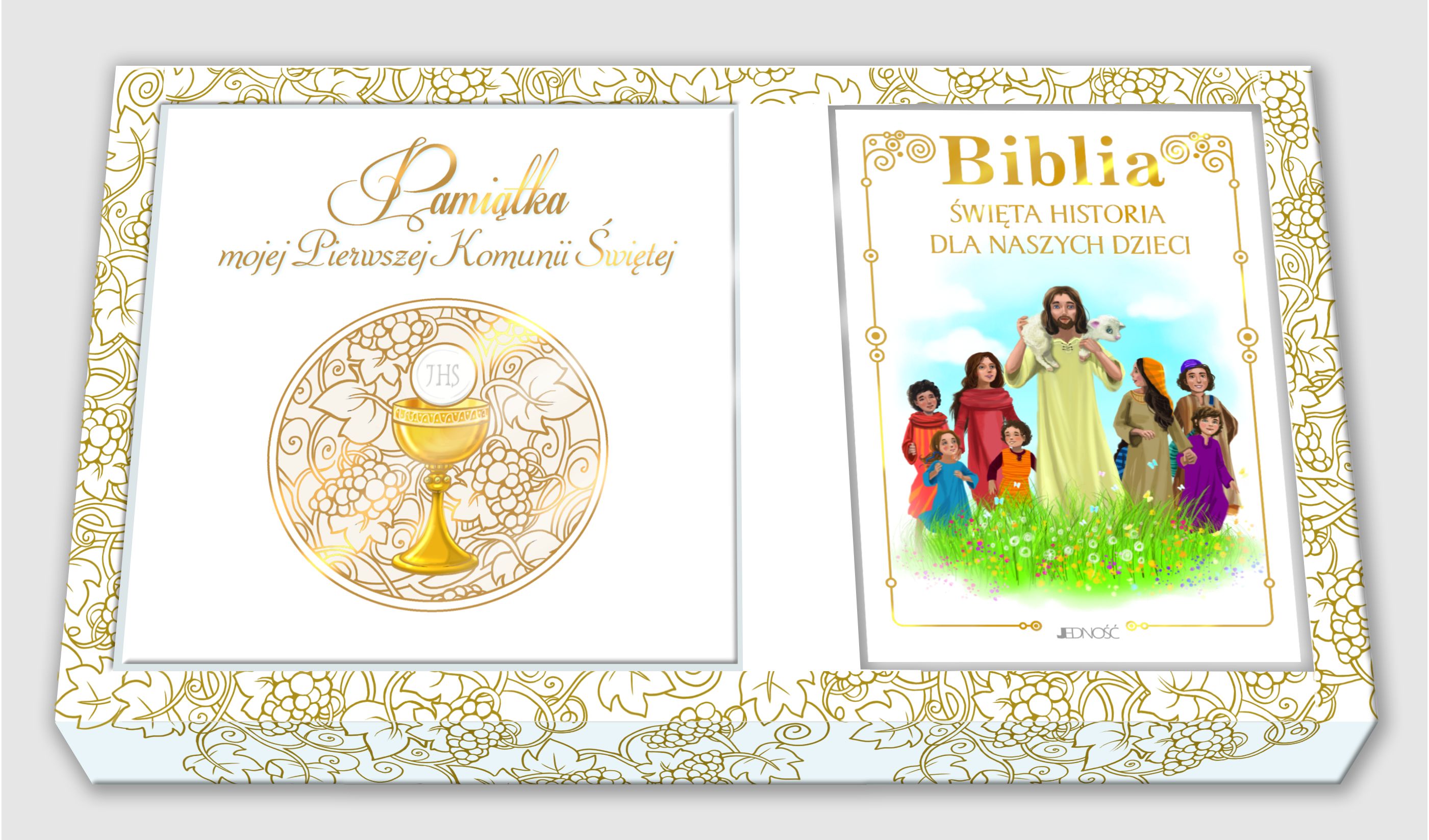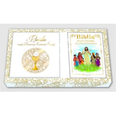 W zestawie znajdują się: 1) Pamiątka mojej Pierwszej Komunii Świętej; 2) Biblia. Święta historia dla naszych dzieci; 3) Torba prezentowa z motywem pierwszokomunijnym. Pamiątka mojej Pierwszej Komunii Świętej, wypełniona wspomnieniami i fotografiami z uroczystości pierwszokomunijnej, zawsze będzie przypominać o tym ważnym i wzruszającym wydarzeniu w życiu dziecka Bożego. Biblia. Święta historia dla naszych dzieci to pięknie wydana książka w poręcznym formacie, zawierająca najbardziej znane historie ze Starego Testamentu oraz dziejów Jezusa i początków Kościoła. Prosty i klarowny język, jakim została napisana, będzie zachętą dla małego chrześcijanina do samodzielnej lektury Biblii. Zestaw dopełnia elegancka torba z okolicznościowym motywem. Odbiorcy – osoby szukające idealnej pamiątki na Pierwszą Komunię Świętą. Dlaczego warto nabyć tę publikację – proste, delikatne rysunki spodobają się każdemu – i rodzicom, i dzieciom; – wiele stron w pamiątkowej książce przeznaczono na wklejenie fotografii, by dzieci zawsze z łatwością mogły przywołać w pamięci urocze chwile radości i szczęścia – nawet gdy dorosną; – zestaw zawiera ponadto Biblię dla dzieci oraz torbę prezentową, co czyni go kompletnym i okazałym upominkiem.