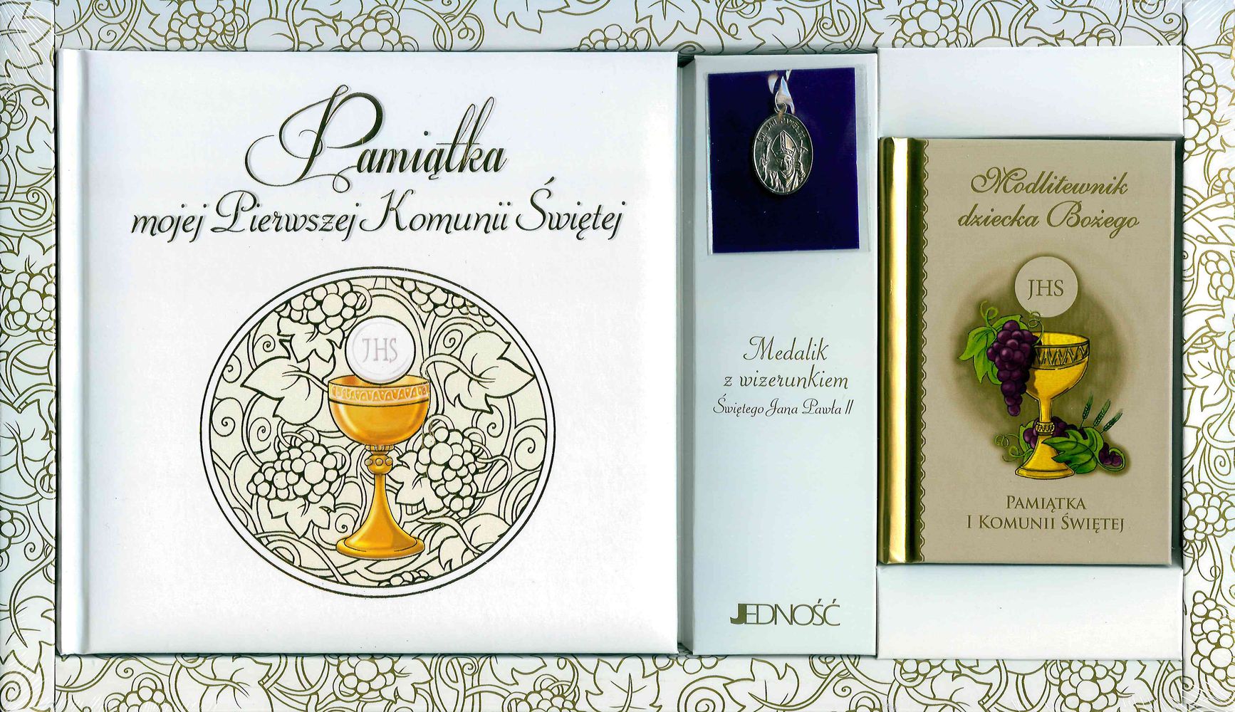 W zestawie znajdują się: 1) Pamiątka mojej Pierwszej Komunii Świętej; 2) Modlitewnik dziecka Bożego. Kocham Ciebie, Jezu; 3) Medalik z wizerunkiem Świętego Jana Pawła II. Pamiątka mojej Pierwszej Komunii Świętej jest pięknie ilustrowanym albumikiem, w którym zapisać można najważniejsze wydarzenia oraz umieścić fotografie z uroczystości pierwszokomunijnej. Modlitewnik dziecka Bożego w złoconej oprawie zawiera wszystkie ważne modlitwy, mały katechizm, popularne pieśni oraz informacje dotyczące sakramentów świętych. Niechaj te pięknie wydane książki wraz z medalikiem przedstawiającym Świętego Jana Pawła II przypominają niezwykłe chwile związane z Pierwszą Komunią Świętą. Jest to prawdziwie chrześcijańska pamiątka tego ważnego i wzruszającego wydarzenia w życiu dziecka Bożego. Odbiorcy – osoby szukające idealnej pamiątki na Pierwszą Komunię Świętą. Dlaczego warto nabyć tę publikację – proste, delikatne rysunki spodobają się każdemu – i rodzicom, i dzieciom; – wiele stron w pamiątkowej książce przeznaczono na wklejenie fotografii, by dzieci zawsze z łatwością mogły przywołać w pamięci urocze chwile radości i szczęścia – nawet gdy dorosną; – zestaw zawiera ponadto pamiątkowy medalik z wizerunkiem Świętego Jana Pawła II, modlitewnik oraz torbę prezentową, co czyni go kompletnym i okazałym upominkiem.