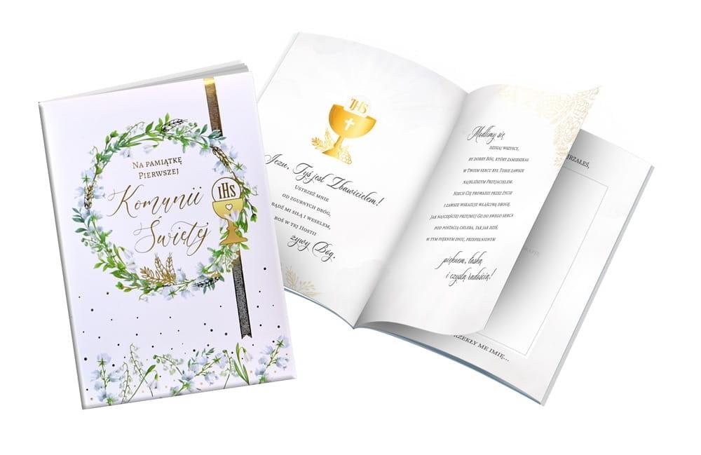Książeczki PMB to produkt wyjątkowy - pięknie wydany, elegancki, a jednocześnie atrakcyjny cenowo. Każda książeczka ma twardą okładkę, kolorowe wnętrze z pięknymi grafikami i cytatami oraz życzenia i miejsce na osobistą dedykację. Na wewnętrznej stronie zdobionej złotą lub srebrną folią okładki wklejona jest specjalna, nieduża koperta, w której można przekazać kartę podarunkową lub banknot. Książeczka PMB Kukartka to idealny prezent na wyjątkową okazję, jaką niewątpliwie jest Pierwsza Komunia Święta. Cechy szczególne: okładka: twarda, wyściełana, zdobienie: złota lub srebrna folia, wnętrze: kolorowe, z grafikami, cytaty, miejsce na dedykację i wpisanie miejsca/godziny uroczystości, gratis: koperta na drobny upominek wewnątrz, okazja: komunia, Pierwsza Komunia Święta.
