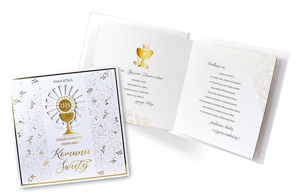 Książeczki PMB Q to produkt wyjątkowy - pięknie wydany, elegancki, zdobiony złotą oraz perłową folią, z kolorowym wnętrzem z pięknymi grafikami i cytatami oraz życzeniami i miejscem na osobistą dedykację. Na wewnętrznej stronie okładki wklejona jest specjalna, nieduża koperta, w której można przekazać kartę podarunkową lub banknot. Książeczka PMB Q Kukartka to idealny prezent na wyjątkową okazję, jaką niewątpliwie jest Pierwsza Komunia Święta. Cechy szczególne: Format: 20 x20 cm zdobienie: złota oraz perłowa folia wnętrze: kolorowe, z grafikami, cytaty, miejsce na dedykację i wpisanie miejsca/godziny uroczystości, gratis: koperta na drobny upominek wewnątrz, okazja: komunia, Pierwsza Komunia Święta.