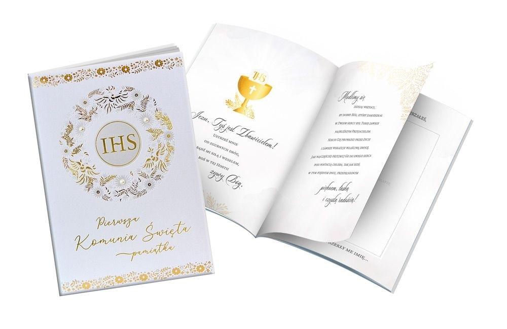 Książeczki PMB Premium to produkt wyjątkowy - pięknie wydany z twardą okładką zdobioną perłową i złotą folią oraz dodatkami takimi jak perły i diamenciki, z kolorowym wnętrzem, pięknymi grafikami i cytatami oraz życzeniami i miejscem na osobistą dedykację. Na wewnętrznej stronie okładki wklejona jest specjalna, nieduża koperta, w której można przekazać kartę podarunkową lub banknot. Książeczka PMB Premium Kukartka to idealny prezent na wyjątkową okazję, jaką niewątpliwie jest Pierwsza Komunia Święta. Cechy szczególne: wymiary książeczki: 15,1 x 20,8 cm. zdobienie: złota oraz perłowa folia lub welur oraz dodatki takie jak perły i diamenciki wnętrze: kolorowe, z grafikami, cytaty, miejsce na dedykację i wpisanie miejsca/godziny uroczystości, gratis: koperta na drobny upominek wewnątrz, okazja: komunia, Pierwsza Komunia Święta.
