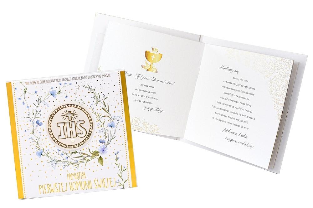 Pamiątka Pierwszej Komunii Świętej - Książeczka Passion Moments Books Q PMB Q-0009 Książeczki PMB Q to produkt wyjątkowy - pięknie wydany, elegancki, zdobiony złotą oraz perłową folią, z kolorowym wnętrzem z pięknymi grafikami i cytatami oraz życzeniami i miejscem na osobistą dedykację. Na wewnętrznej stronie okładki wklejona jest specjalna, nieduża koperta, w której można przekazać kartę podarunkową lub banknot. Książeczka PMB Q Kukartka to idealny prezent na wyjątkową okazję, jaką niewątpliwie jest Pierwsza Komunia Święta. Cechy szczególne: Format: 20 x 20 cm zdobienie: złota oraz perłowa folia wnętrze: kolorowe, z grafikami, cytaty, miejsce na dedykację i wpisanie miejsca/godziny uroczystości, gratis: koperta na drobny upominek wewnątrz, okazja: komunia, Pierwsza Komunia Święta.