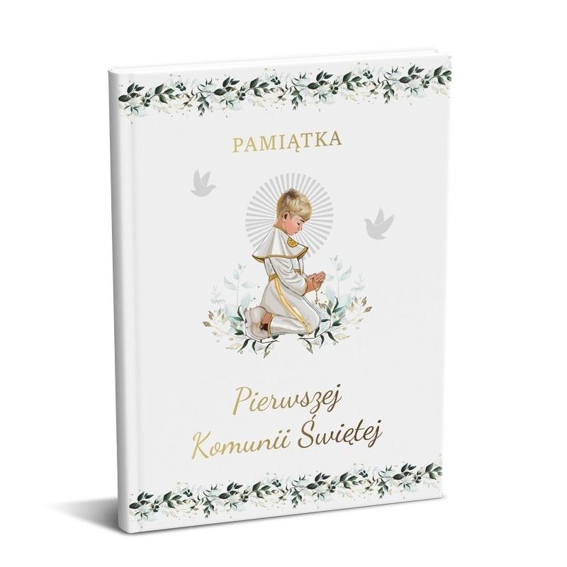 Książeczka z okazji I Komunii Świętej w formacie A5 wraz z kopertą w środku. Wyjątkowa książeczka upamiętniająca jeden z najważniejszych dni w życiu dziecka - Pierwszą Komunię Świętą. Elegancka i starannie wykonana pamiątka w formacie A5, ozdobiona złotymi detalami i delikatnymi ilustracjami nawiązującymi do sakramentu Eucharystii. Format: A5 (poręczny i elegancki), Kolorowe ilustracje w środku, które nadają całości wyjątkowego charakteru, Miejsce na osobiste wpisy - idealna do zachowania wspomnień z uroczystości, Koperta wewnątrz.