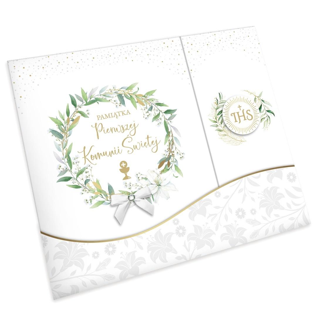 Książeczka z okazji I Komunii Świętej w formacie A4 wraz z kopertą w środku.