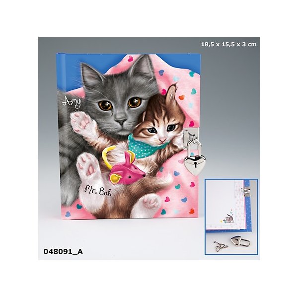 TOP MODEL - prześliczny pamiętnik zamykany na kłódkę w kształcie serca. Pomieści wszystkie sekrety. Zdobiona brokatem okładka przedstawia parę słodkich kociaków.