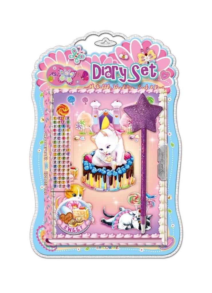 W zestawie znajduje się: ozdobny długopis, naklejka 3D, cekiny samoprzylepne do ozdabiania oraz 2 kluczyki do zamka.