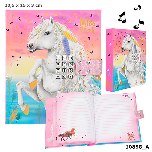 Pamiętnik na kod Miss Melody, na najskrytsze zapiski, po otwarciu przez chwilę gra modną piosenkę Rewrite the stars.