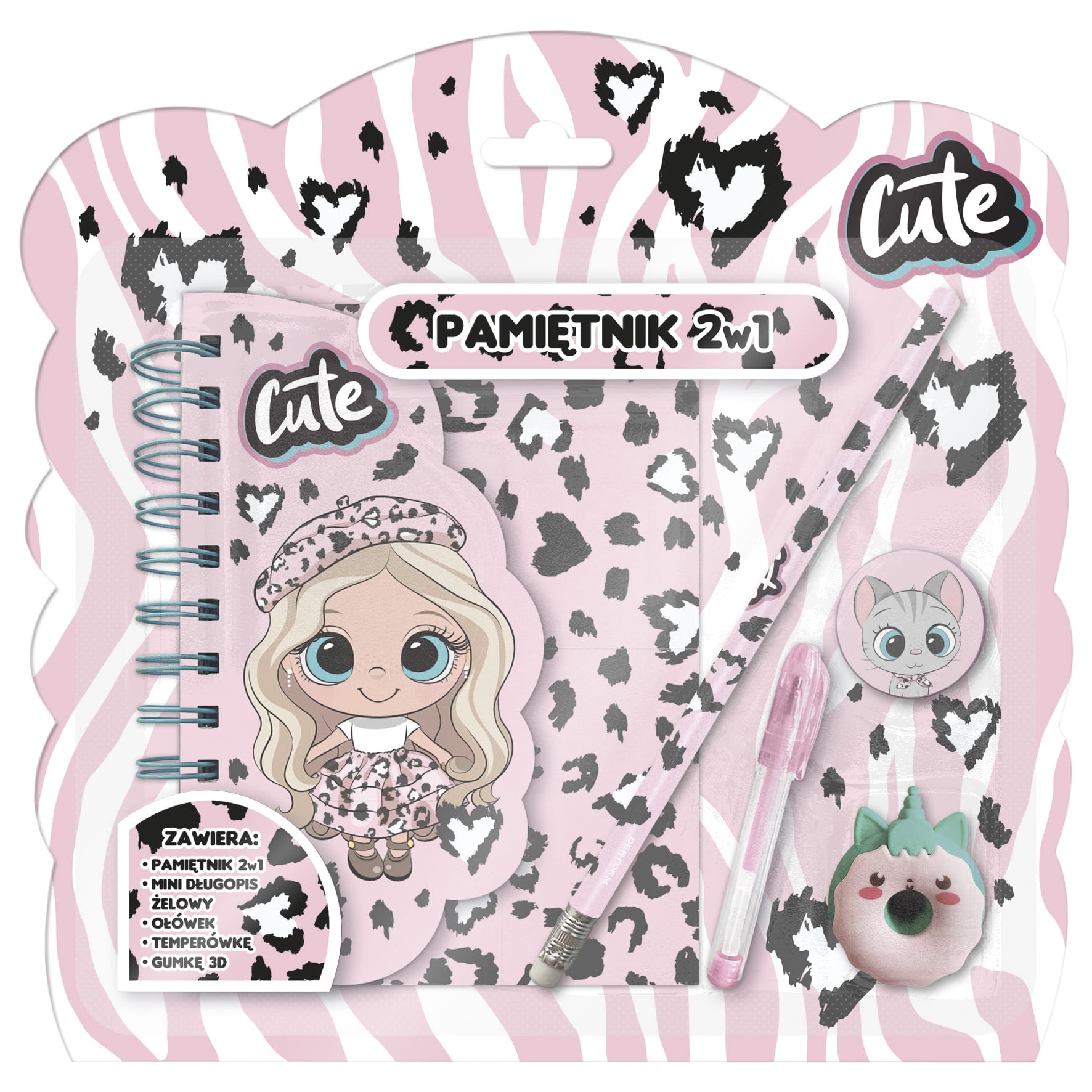 Pamiętnik z kłódką oraz zestawem przyborów dostępny jest w 4 wzorach. Produkt zapakowany w ozdobny blister z możliwością powieszenia. W skład zestawu wchodzi pamiętnik z kłódką i dołączonym notesem, kształtowa rozkładana gumka do mazania, ołówek oraz mini długopis żelowy. Produkt idealnie sprawdzi się na prezent.