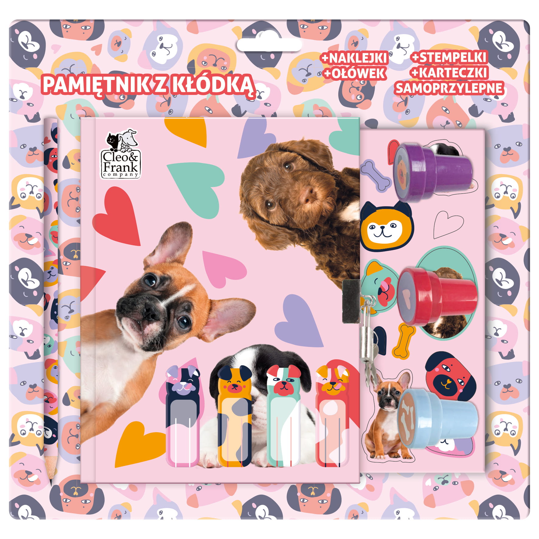 Pamiętnik z kłódką i stempelkami + zestaw przyborów Cleo i Frank Pies 40 DERFORM