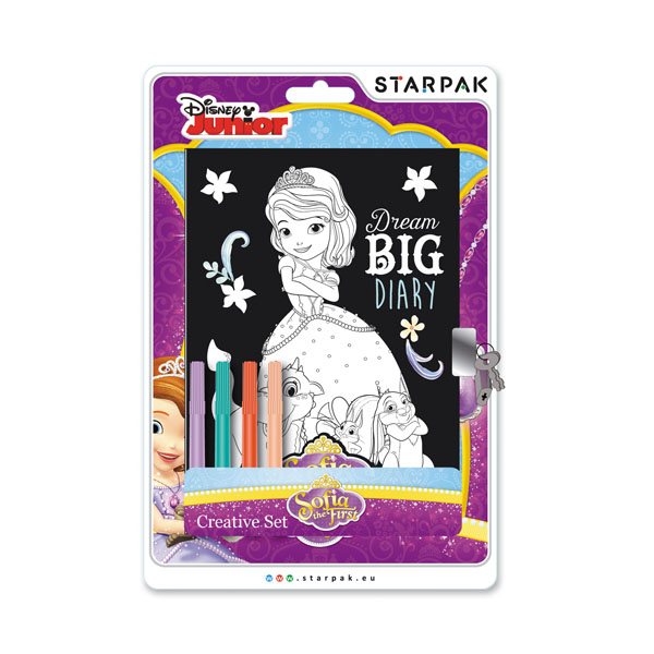 Zestaw kreatywny z pamiętnikiem o wymiarze 178x127mm i pisakami. Okładka jest zadrukowana welurowym, wypukłym nadrukiem stanowiącym kontury obrazka z ulubionymi bohaterami do samodzielnego pokolorowania, dzięki czemu każdy pamiętnik będzie oryginalny i unikatowy. Pamiętnik jest zamykany na kłodkę dla lepszej ochrony małych sekretów dziecka.