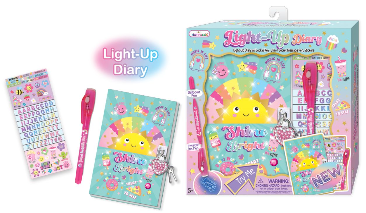 Okładka pamiętnika jest dodatkowo podświetlana kolorowymi mini-światełkami, które podświetlą się po naciśnięciu przycisku!!