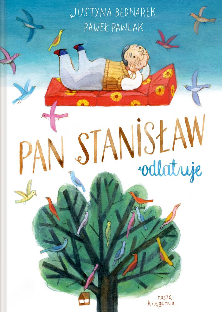 Pan Stanisław czuje w kościach, że czas na WIELKĄ PRZYGODĘ. Prosi więc wnuczka Frania, by ten zaopiekował się jego pieskiem Znajdkiem-Kręciołkiem, i odważnie wyrusza w podróż życia – ku chmurom. Wkrótce odkrywa z zachwytem, że świat z góry wygląda zupełnie inaczej. Co jednak nastąpi, gdy starszy pan czubkiem głowy dotknie nieba? I czy to prawda, że błękit jest miły w dotyku i bardzo mięciutki? Ta poetycka i wzruszająca opowieść, snuta wspólnie przez Justynę Bednarek i Pawła Pawlaka, z pogodą przedstawia temat pożegnania z bliską osobą i pomaga dziecku oswoić się ze stratą. Justyna Bednarek jest romanistką, dziennikarką i autorką książek dla dzieci. Mieszka na warszawskich Bielanach, a dom dzieli z dziećmi, psami, myszoskoczkami, kurami oraz papugą. Jej „Niesamowite przygody dziesięciu skarpetek”, zilustrowane przez Daniela de Latoura, otrzymały wiele ważnych nagród oraz nominacji, a także znalazły się na liście lektur szkolnych. Dla Wydawnictwa „Nasza Księgarnia” Justyna Bednarek pisze serię dla przedszkolaków „Dusia i Psinek-Świnek” ilustrowaną przez Martę Kurczewską. Paweł Pawlak jest ilustratorem precyzyjnym, sumiennym, zdyscyplinowanym i do tego stopnia odpowiedzialnym, że ilustracje koloruje też od spodu. Ostrzenia ołówków uczył się na stażu prowadzonym przez amerykańskich specjalistów, do malowania stosuje pędzelki wyprodukowane z włókien nylonowych hodowanych w dobrostanie, a prąd, który napędza jego komputer, pochodzi wyłącznie z legalnych źródeł. Dba, by postacie, które przedstawia na swoich ilustracjach, otrzymały gruntowne wykształcenie i były dobrze wynagradzane za swoją pracę.