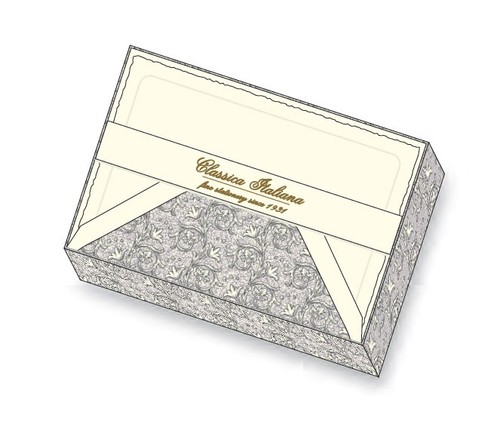 Papeteria w ozdobnym pudełku, papier o gramaturze 390g/m2. W zestawie znajduje się 10 kopert i 10 kartek. Produkt z ekskluzywnej galanterii wyprodukowany we włoskiej manufakturze.