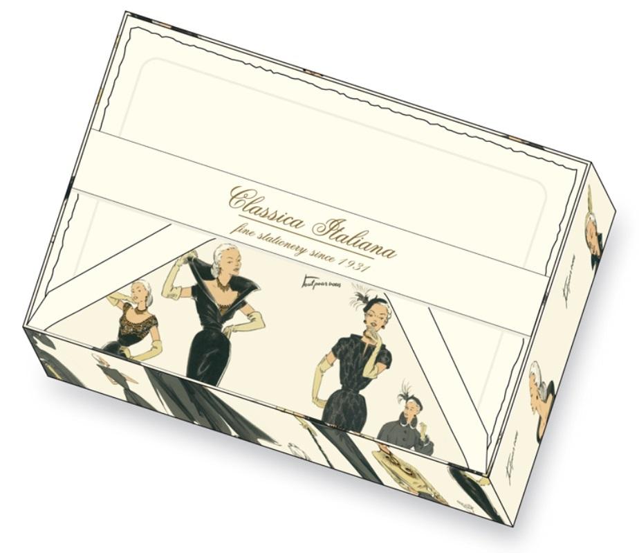 Papeteria w ozdobnym pudełku, papier o gramaturze 390g/m2. W zestawie znajduje się 10 kopert i 10 kartek. Produkt z ekskluzywnej galanterii wyprodukowany we włoskiej manufakturze.