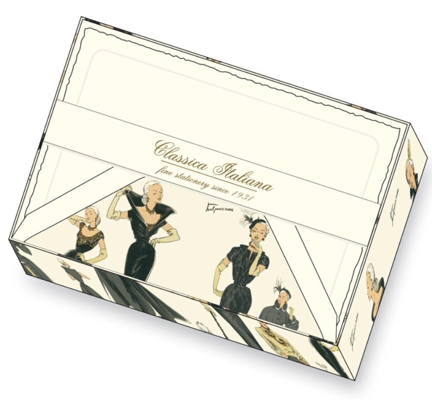 Papeteria w ozdobnym pudełku, papier o gramaturze 240g/m2. W zestawie znajduje się 10 kopert i 10 karnetów.