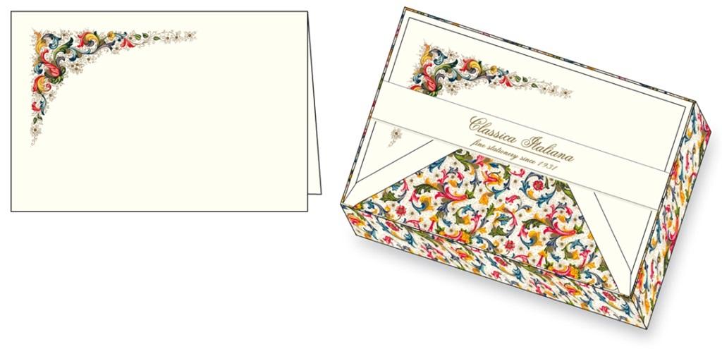 Papeteria w ozdobnym pudełku z przykrywką, papier o gramaturze 240g/m2. W zestawie znajduje się 10 kopert i 10 karnetów.