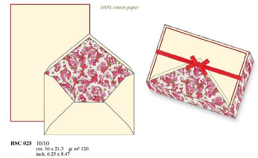 Papeteria w ozdobnym pudełku z przykrywką, koperty posiadają zaznaczoną linię, papier bawełniany o gramaturze 120g/m2. W zestawie znajduje się 10 kopert i 10 papierów listowych. Produkt z ekskluzywnej galanterii wyprodukowany we włoskiej manufakturze.