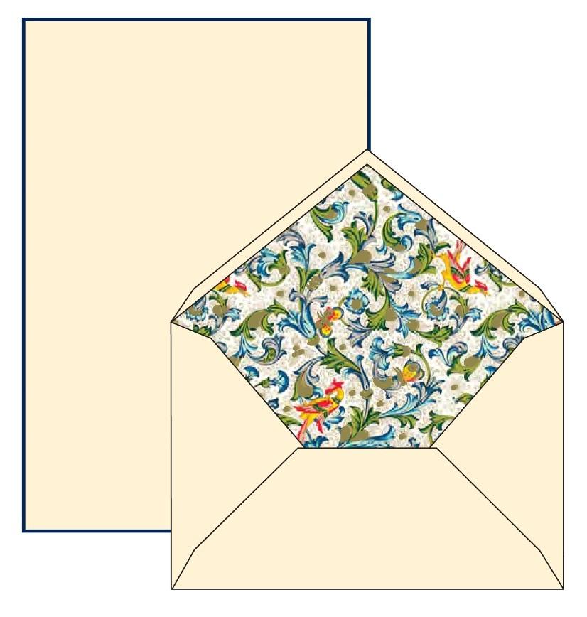 Papeteria w ozdobnym pudełku z przykrywką, koperty posiadają zaznaczoną linię, papier bawełniany o gramaturze 120g/m2. W zestawie znajduje się 10 kopert i 10 papierów listowych. Produkt z ekskluzywnej galanterii wyprodukowany we włoskiej manufakturze.