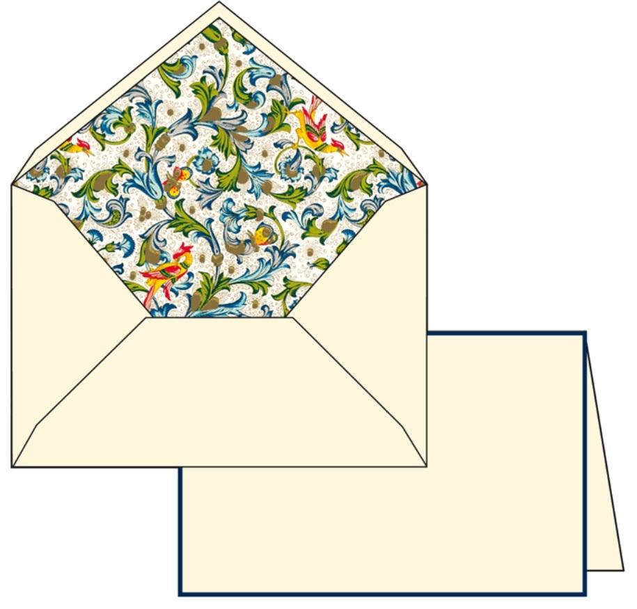 Papeteria w ozdobnym pudełku, papier o gramaturze 240g/m2. W zestawie znajduje się 10 kopert i 10 karnetów.