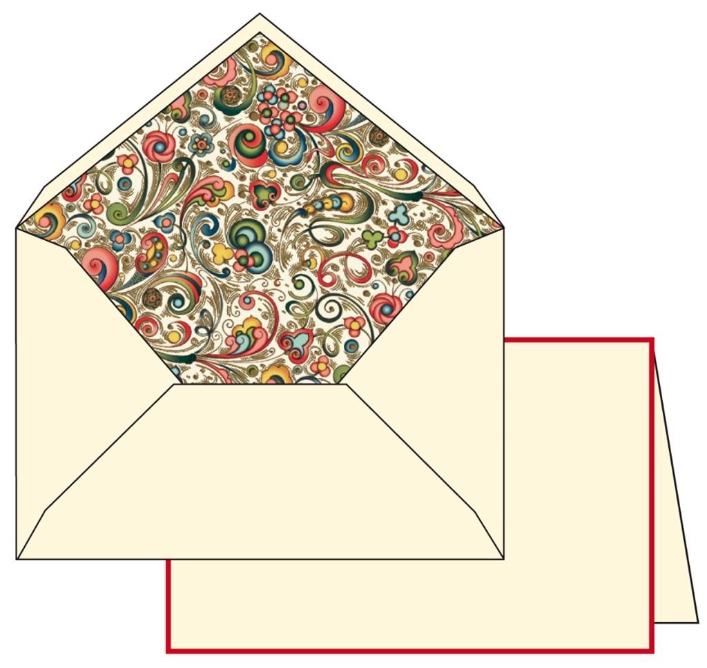 Papeteria w ozdobnym pudełku, papier o gramaturze 240g/m2. W zestawie znajduje się 10 kopert i 10 karnetów.