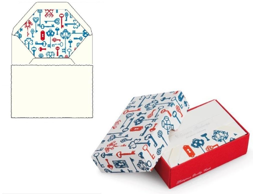 Papeteria w ozdobnym pudełku, papier o gramaturze 390g/m2. W zestawie znajduje się 10 kopert i 10 kartek.